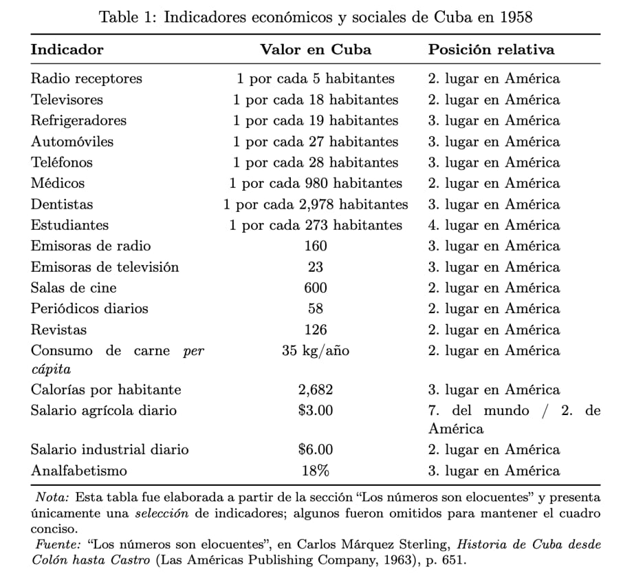 Este diagnóstico también se refleja en indicadores agregados: hacia 1958, Cuba era aproximadamente un 80 % más rica en PIB per cápita que el promedio de América Latina, y su mortalidad infantil era menor a un tercio de la observada en el resto de la región.